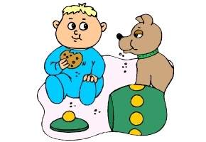 Motiv: Baby, Junge, Mädchen, Kekse, Hund, Sand,