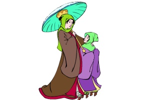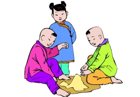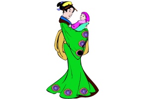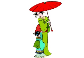 Motiv: Sand, Mädchen, Junge, Schirm, Kimono, Mutter