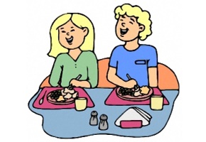 Motiv: Junge, Mädchen, Essen, Tablett, Stuhl, Arzt,