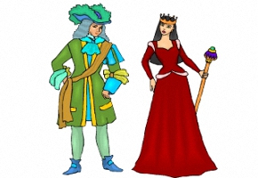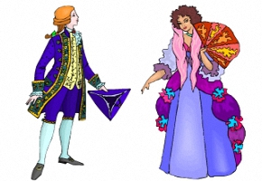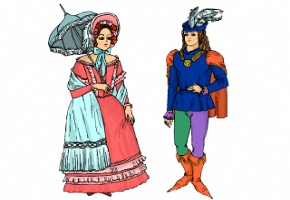 Taube, Hut, Schleier, Fächer, Gewänder und Schmuck. |