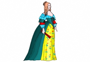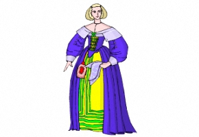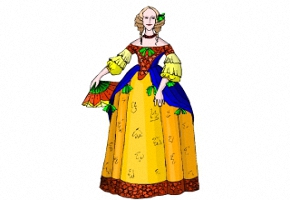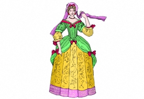 Sattel, Taube, Hut, Schleier, Fächer, Gewänder und