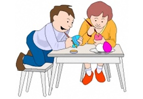 Motiv: Junge, Tisch, Stuhl, Pinsel, Farbe, Eier,