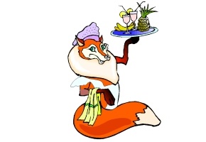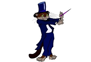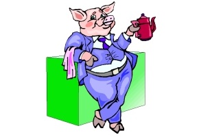 Obst, Kanne, Schwein, Anzug, Katze und Hut.