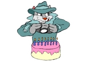 Motiv: Katze, Hut, Mantel, Fotoapparat, Kuchen,