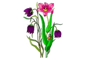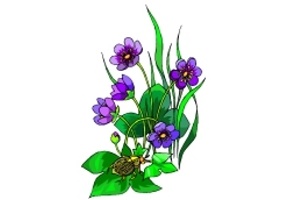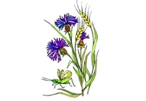 Blumen, Käfer, Spinne und blaue Blumen. |