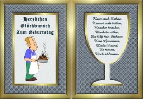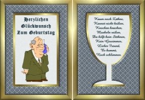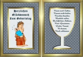 Grußkarten kostenlos ausdrucken & Lustige Geburtstagskarten mit Text gratis Online Downloaden. Die gratis Geburtstagssprüche, Geburtstagsgrüße, Glückwünsche, Geburtstagswünsche, Glückwunschkarten, Geburtstagskarten oder Kindergeburtstagskarten PDF Dateien zum Ausdrucken, finden Sie unter dem dazu gehörigen, kleinen Bild zur Glückwunschkarte. Sie finden hier weiter, Schöne, Coole, Witzige, Heitere und kostenlose SMS Sprüche zum Geburtstag, Gedichte, Verse, Reime, Weisheiten und Zitate. Malvorlagen & Ausmalbilder. Erst wenn Sie eine Glückwunschkarte, Grußkarte oder Geburtstagskarte auf Fotopapier ausgedruckt haben, können Sie sehen, wie gut die Qualität dieser Geburtstagskarten wirklich ist. Gratulation und Glückwunsch zum Geburtstag Karten für Kinder, Männer, Frauen, Bruder, Schwester, Tochter, Sohn, Vater, Mutter, Chef, Freund, Freundin, Bekannte, Neffe, Nichte, Partner, Nachbarn, Verwandte, Tante, Onkel, Opa, Oma, Enkel, Mädchen, Jungen, Teenager, Arbeit, Firma, Kollegen, Arbeitskollegen, Clubs, Vereine, Jugendliche, Erwachsene, Senioren mit 3D Bilderrahmen. Geburtstagskarten: Motiv Geburtstagsgeschenk, Schreibtisch, Computer, Luftballon, Affe, Kostüm, Baby, Kind, Traum, Beruf, Doktor, Spritze, Flasche, Glas, Anzug, Krawatte, Bademantel, Thermometer, Krank, Wärmflasche, Springen, Freude, Wütend, Zigarre, Bauarbeiter, Helm, Topf, Huhn, Spiegel, Bürste, Handtuch, Tüte, Einkaufen, Pfanne, Angebrannt, Essen, Schürze, Besen, Fegen, Staub, Telefon, Weinen, Brille, Schaufel, Spaten, Tisch, Toaster, Toastbrot, Tasse, Kaffeekanne, Kaffee, Frühstück, Perücke, Cocktail, Obst, Cocktail, Tanzen, Musik, Hippie, 70iger Jahre, Gitarre, Sombrero, Mexiko, Rasseln, Punker, Rock, Nackt, Fass, Nachthemd, Bart und Geld.