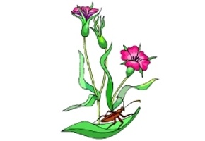 Spinne, Grille, rosa Blumen, gelbe Blumen, Blätter