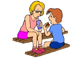 Motiv: Junge, Mädchen, Hamburger, Trinken, Bank,