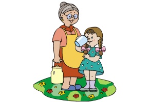 Motiv: Junge, Mädchen, Wiese, Blumen, Stuhl, Eimer,