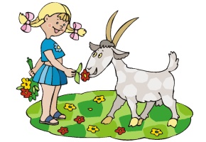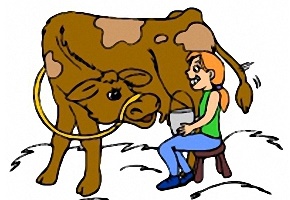 Kuh, Ziege, Oma, Gänse, Milchkanne und Glas. |