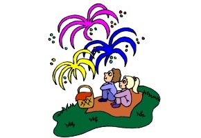 Motiv: Junge, Mädchen, Decke, Korb, Feuerwerk,