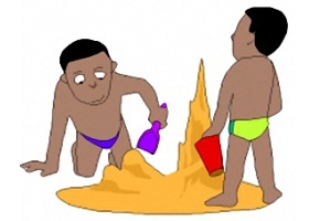 Eimer, Schaufel, Sand, Sessel, Buch, Ball und