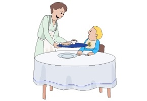 Motiv: Junge, Mutter, Vater, Tische, Tablett, Essen,