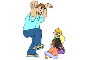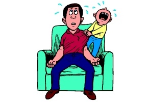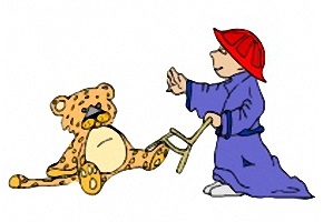 Motiv: Junge, Mädchen, Vater, Helm, Teddybär, Stuhl,