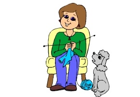 Motiv: Mädchen, Frau, Stuhl, Stricknadeln, Tisch,