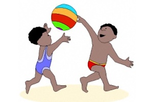 Regenschirm, Badeanzug, Badehose und Ball. |