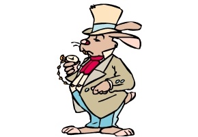 Anzug, Uhr, Hut, Baumstamm, Möhre und Gieskanne. |