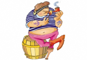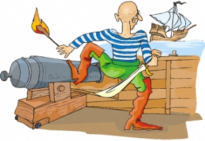 Schiff, Meer, Kanone, Säbel, Mann, Bart und Pfeife. |