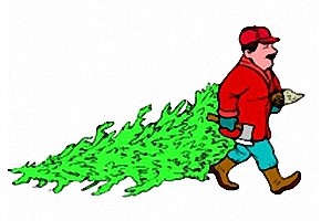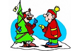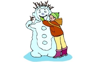 Motiv: Junge, Männer, Schneemann und Weihnachtsbaum. |