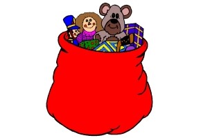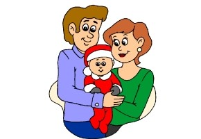 Motiv: Weihnachtsmann, Eltern und Baby, Spielzeug