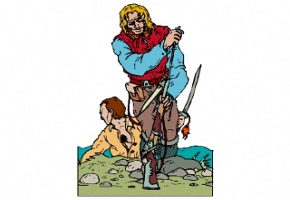 und Piraten, Schiff, Geländer, Gewehr, Schwert, Mann