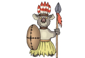 Motiv: Haus, Wurm, Koalabär, Federn, Schild, Speer,